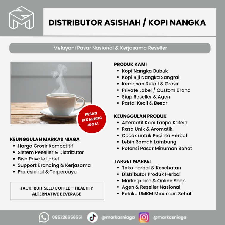 Melalui Distributor Asisah / Kopi Nangka, Anda kini bisa mendapatkan produk kopi nangka berkualitas tinggi dengan sistem kemitraan yang fleksibel. Distributor ini melayani pasar nasional dan membuka peluang besar bagi reseller, agen, hingga pelaku UMKM untuk ikut berkembang di industri minuman sehat.