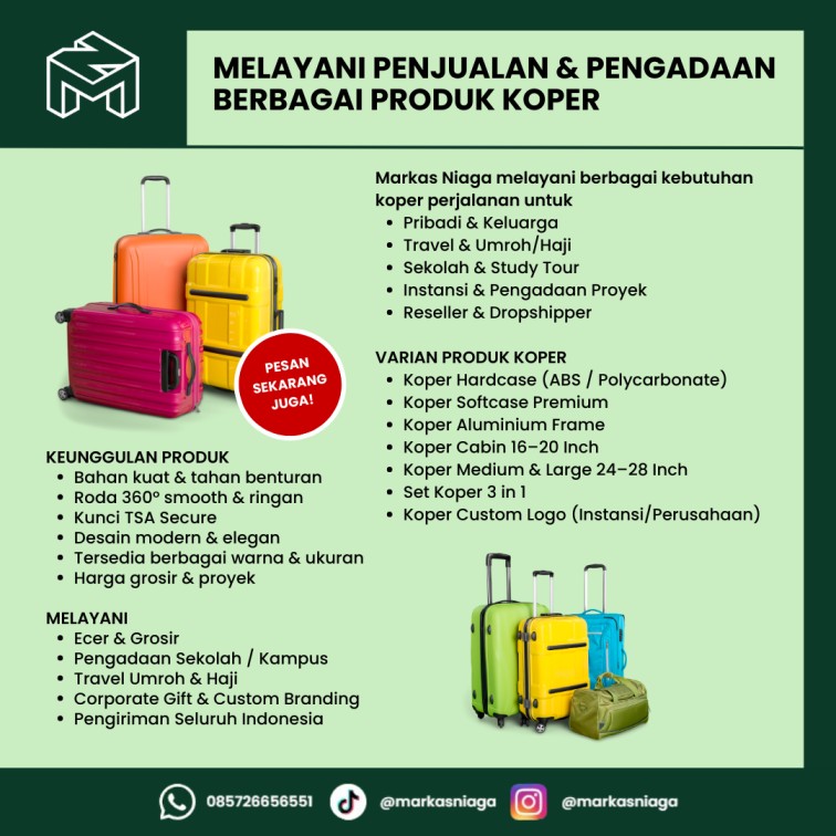 Markas Niaga hadir sebagai distributor yang melayani penjualan dan pengadaan berbagai produk koper untuk kebutuhan pribadi, keluarga, sekolah, travel umroh haji, instansi, hingga reseller. Dengan pilihan produk yang lengkap, kualitas yang baik, serta layanan pengiriman ke seluruh Indonesia, Markas Niaga menjadi salah satu solusi terbaik untuk kebutuhan koper.