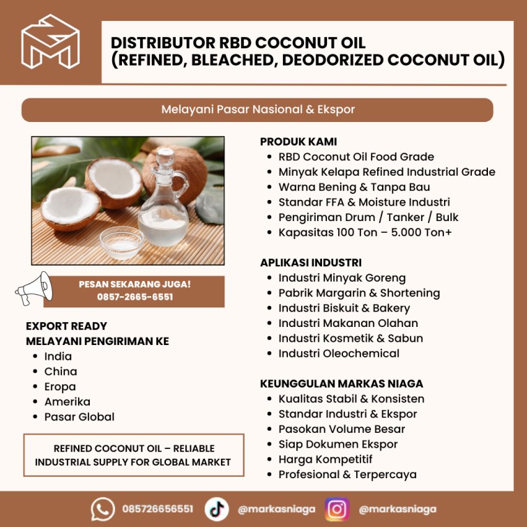 Jika Anda membutuhkan pasokan RBD Coconut Oil berkualitas tinggi untuk industri atau ekspor, segera hubungi distributor terpercaya dari Markas Niaga.