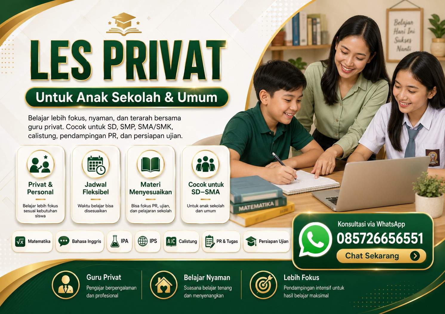 Belajar lebih fokus dengan bimbingan privat untuk SD, SMP, SMA/SMK, calistung, pendampingan PR, dan persiapan ujian.