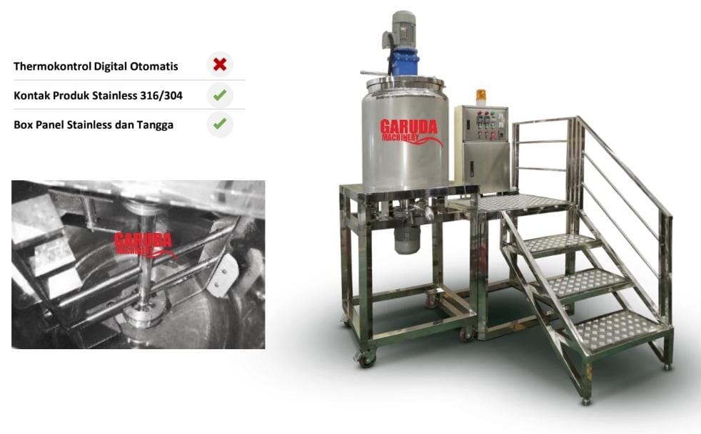 Dengan kapasitas 500 liter, mesin ini sangat cocok untuk pabrik kosmetik dan industri lainnya yang memerlukan produksi dalam jumlah besar.