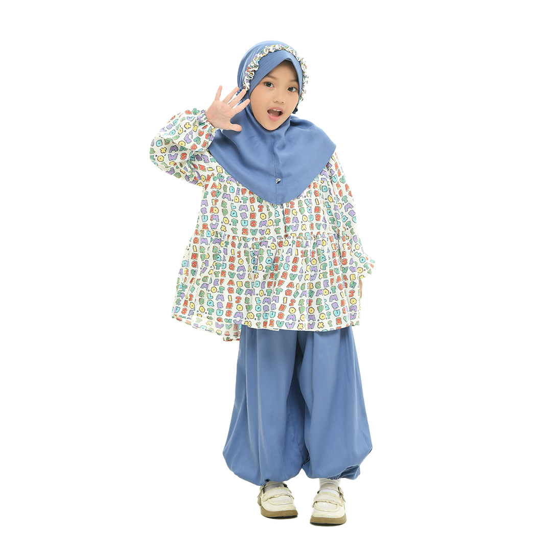 Tunik dalam setelan ini dilengkapi dengan detail ruffle kecil pada garis leher yang menambah kesan manis dan feminim pada penampilan anak. Selain itu, terdapat pengulangan kerutan pada bagian depan tunik, yang membuat tampilan lebih dinamis dan elegan. Kerutan ini tidak hanya estetis, tetapi juga memberikan sedikit fleksibilitas pada ukuran tunik, membuatnya nyaman dipakai. - Lengan Karet yang Wudhu Friendly