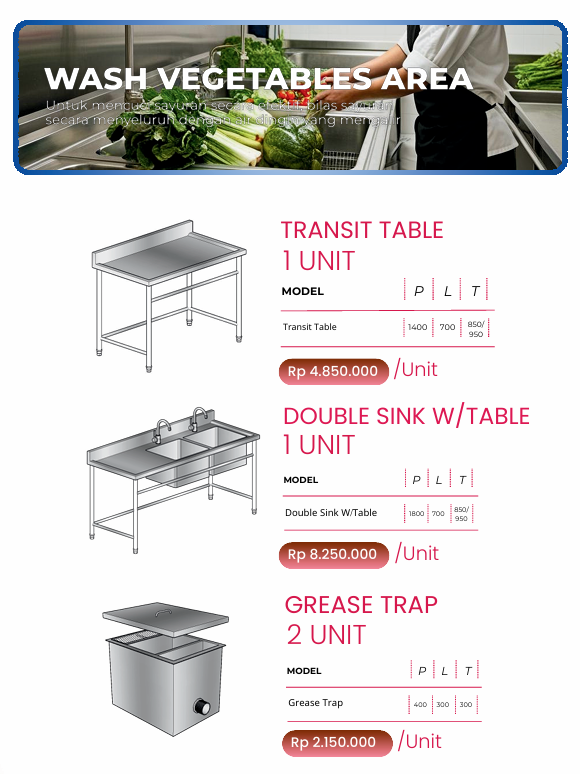 Paket Dapur Double Sink W/Table 1 Unit menawarkan harga yang sangat kompetitif mengingat kualitas material dan fungsionalitas yang ditawarkan. Dengan dua wastafel yang terpisah dan desain meja yang efisien, produk ini sangat cocok untuk digunakan di Wash Vegetables Area. Anda mendapatkan meja yang kokoh, praktis, dan mudah dirawat, menjadikannya investasi yang sangat baik untuk meningkatkan kebersihan dan efisiensi dapur Anda.