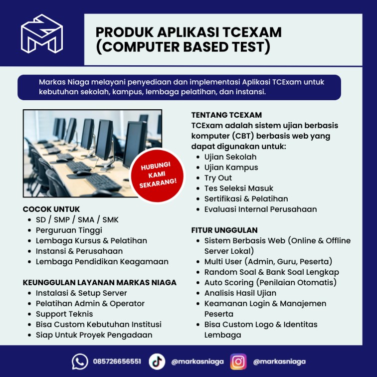 Bagi Anda yang sedang mencari supplier aplikasi TCExam, vendor aplikasi TCExam, penyedia aplikasi TCExam, distributor aplikasi TCExam, atau jasa instalasi TCExam di Indonesia, Markas Niaga dapat menjadi partner yang tepat untuk membantu proses pengadaan, setup, implementasi, hingga pendampingan teknis. Markas Niaga menampilkan layanan dan produk berbasis aplikasi melalui website resminya, serta menyediakan kanal kontak WhatsApp 0857-2665-6551 untuk konsultasi langsung.
