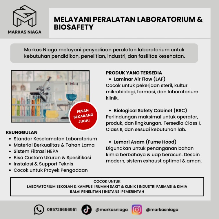 Markas Niaga siap menjadi mitra untuk kebutuhan laminar air flow laboratorium, biological safety cabinet class II, biosafety cabinet laboratorium, lemari asam kimia, fume hood laboratorium, hingga sistem filtrasi HEPA laboratorium. Cocok untuk laboratorium pendidikan, fasilitas kesehatan, industri farmasi, laboratorium mikrobiologi, dan proyek pengadaan modern.