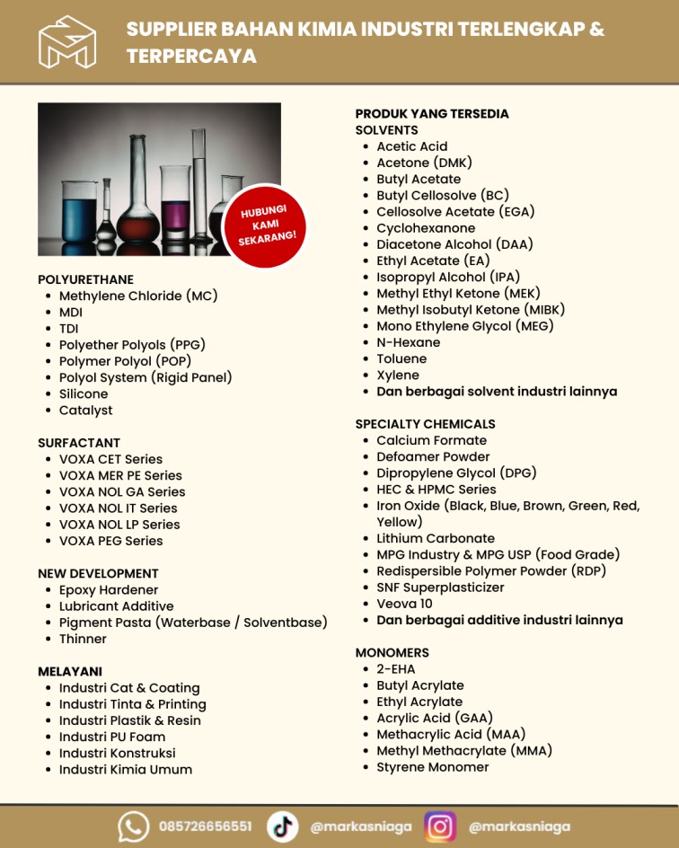 Kami hadir sebagai supplier Methylene Chloride (MC) terpercaya yang menyediakan produk berkualitas industri dengan standar kemurnian tinggi, stabilitas konsisten, serta pasokan yang dapat diandalkan. Dengan pengalaman dalam distribusi bahan kimia, kami siap menjadi mitra strategis bagi berbagai sektor industri di Indonesia.